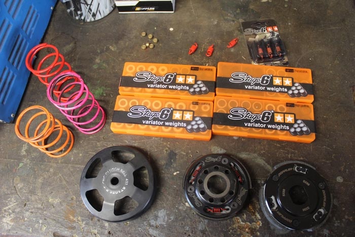 Först, såhär bör det se ut när man ska justera in en variator optimalt. På bild är det tryckfjädrar i 3 olika hårdheter, vikter från 2,5g till 9,5g, 3 olika styrkor på kopplingsfjädrarna, t.o.m två olika kopplingar!