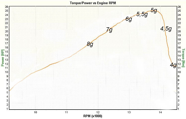 Om vi hade t.ex 8g vikter, skulle motorn varvat c:a 11800rpm och genererat c:a 16,5hk. Det är ju inte illa, men långt ifrån motorns maxeffekt som är i detta fall på 25,5hk. Motorn har således för tunga vikter…